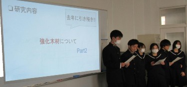 校内課題研究発表会 2026.1.21本校三年生が一年間を通して取り組んだ課題研究の発表会が行われました。各クラスで選ばれた代表6テーマの発表が、オンラインで各教室に配信され、今年度は建築科の「強化木材について PART 2」が投票により秋田工業代表として、全県課題研究発表会に参加することが決まりました。 |
